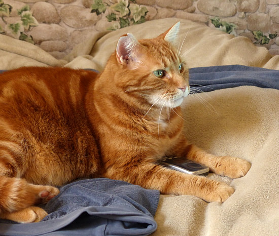 Das ist kein gestelltes Bild ... das Telefon lag halt auf dem Bett und Mickey hätte wirklich genug Platz gehabt, sich daneben zu legen ... aber es ist nun mal so .. wenn irgendwas auf dem Bett liegt, wird sich drauf gelegt ... das kann auch ein Kleiderbügel sein ... und sowieso ganz wichtig: mein Schlafanzugoberteil muss da liegen ... nur wenn Mickey sich drauf legen kann, ist sein Glück perfekt. Nun schläft er selig auf dem blauen Frottee. Das Telefon hat allerdings wieder den Besitzer gewechselt ;).