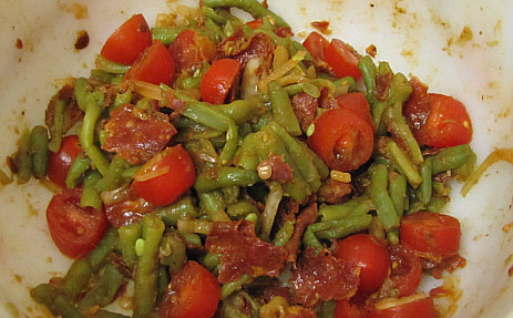 ... etwas anderen Bohnensalat fotografiert ... man nehme grüne Bohnen, gare sie und mische sie dann mit Zwiebeln, Cocktailtomaten und ausgelassener Chorizowurst. Das Dressing bzw. die Würze besteht aus Balsamico, Tomatenmark, Tomatensaft, Öl, Salz und Pfeffer dazu, dann passt das.