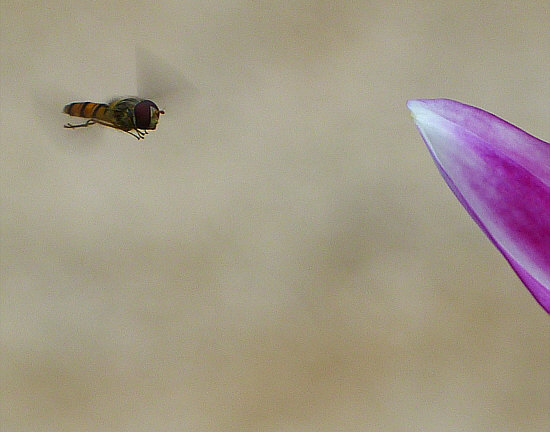 Eine Schwebfliege, die in der Luft steht, um kurz danach auf der Blüte zu landen.