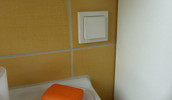 der Lichtschalter ... ist gar keiner, aber jeder denkt so ... das ist aber ne Steckdose mit Klappe. Im Spiegelschrank ist zwar auch ne Steckdose drin, aber ich hatte so die Idee, dass ich mal froh sein könnte um ne zweite Steckdose im Bad (z.B. wenn in der einen die elektrische Zahnbürste aufgeladen wird und ich die andere brauche).