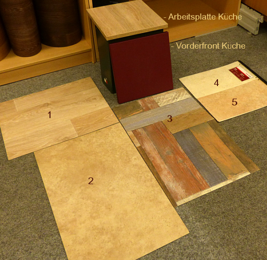... einfach die Nummer 3 genommen und auf den Boden zu den Küchenmustern gelegt. Auwei ... aber ... farblich passt das sogar ... aber nee, geht doch nicht ... oder ... der Verkäufer kommt und meint "da ist aber jemand mutig" ... während ich mich immer mehr an diesem Boden festguckte. Jetzt, wo er da liegt ... kann ich dann noch die normale 2 oder die 4 nehmen ... kann ich jetzt noch die einmalige Chance, mal was verrücktes zu tun, sein lassen ?