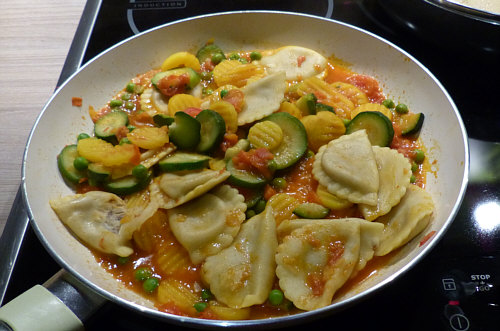 Ein paar gefüllte Nudeln aus dem Kühlregal und dazu Iglo Pfannengemüse mit Tomatensoße.