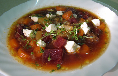 - wenn man, wie wir, bereits gekochte rote Beete nimmt, dann kommen erst Brühe und Pi und Lo in den Topf, etwas köcheln lassen und dann Ka, Mö und Weiko hinein. 20 Minuten kochen lassen (nach 15 Minuten die gekochte rote Beete dazu geben).