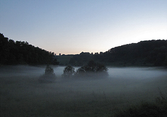 Ein so unendlich schönes Motiv ... und kein Parkplatz weit und breit ... ich hätte mitten auf der Straße parken müssen und das in einer Kurve. Also weiter fahren, das Auto abstellen, zurücklaufen ... und während des Laufens wurde der Nebel immer lichter und der Abend dunkler. Das Traumbild war beim Fotografieren nur noch ein halber Traum gewesen.