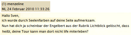 Außerdem fragt man da erstmal per Mail bei mir an ... zumal ich sonst ja auch angemailt werde, wenns was zu kritisieren gibt.