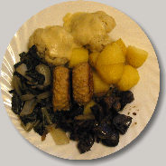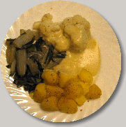 ... bei Beate: Kartoffeln (mit Grün bestreut), Blumenkohl (mit weißer Mehlschwitz-Gemüsewasser-Soße) und Mangold.