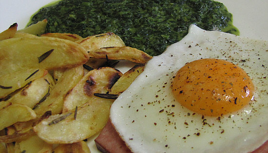 Auf dem Teller heute Abend ... und ich gebe zu, dass wir heute nicht möglichst lange kochen wolten, sondern möglichst schnell essen ... also gabs Fleischkäse und Spiegelei (beides geht schnell) ... Blubb-Spinat (nur erhitzen und mal nicht der von Iglo) und TK-Rosmarinkartoffeln.