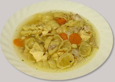 In der Brühe der ausgekochten Hühnerrückenteile wurden Nudeln gegart, Eierstich kam dazu und selbstgemachte Semmelbrösel-Nocken (Nocken= unrunde Knödelchen, weil mit dem Löffel abstechen schneller geht als Knödel formen), dann das Suppen-Gemüse vom gestrigen Kochen dazu und kleine abgelöste Fleischstückchen. Gewürzt wurde mit Brühpulver und etwas Pfeffer.