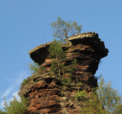 Ein weiteres "Baum wächst auf Felsen"-Bild ... das ist der Heufelsen in Hinterweidenthal ... im Kalenderblatt ist der Teufelstisch, der ein paar Kilometer vom Ort entfernt ist, zu sehen.