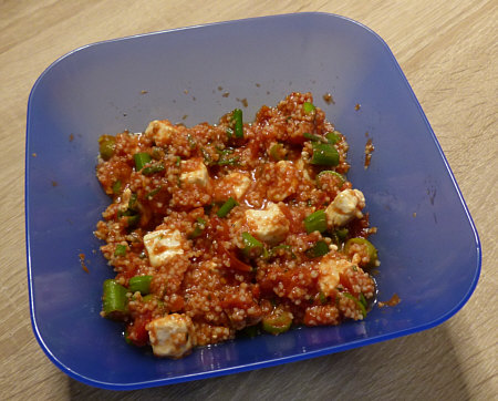 Es war noch Couscous da ... der wurde bekannt gemacht mit Feta, Lauchzwiebeln und Dosentomaten. Ich hatte auch Couscous, aber bei mir lernte er Soße und Stockschwämmchen kennen.
