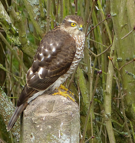 Zur Zeit ein regelmäßiger Gast in unserem Garten ... ein Sperber. Zumindest hab ich ihn als solchen identifiziert ... eigentlich frisst der ja Vögel ... aber die Meisen hüpfen um ihn rum, als wären sie nicht in Gefahr.