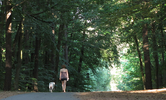 Die Frau mit dem Hund läuft durch den heißen Abend.