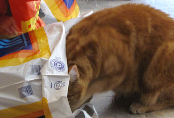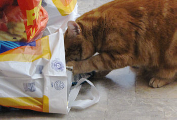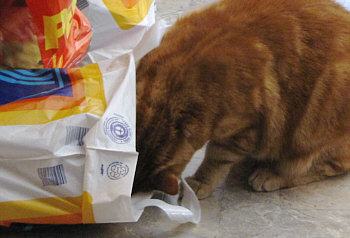 ... hat er den Beutel mit dem Trockenfutter in den Krallen, hält ihn damit fest und beginnt ihn aufzubeißen. Überleben in der Wildnis, Rüdiger Nehberg wäre stolz auf ihn ;)).