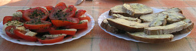 Tomate-Mozzarella-Päuschen mit Halbfettmargarinebrot.