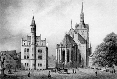 perleberg, marktplatz mit rathaus, jacobikirche und rolandsäule, um 1860