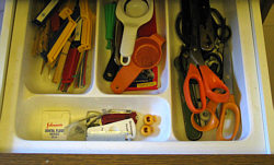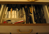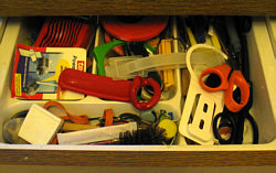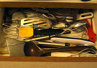 Entsorgt: Hähnchenschere (wir haben schon lange keine freilaufenden Hühner mehr), Dosenöffner (der schon lange nix mehr geöffnet hat), Gummis (die eher reißen denn sie etwas zusammenhalten), alter Pinsel (iiiih) undsoweiter.