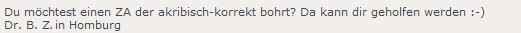 Nachtrag: ich hol mal noch weiter aus ... obwohl ich das gar nicht wiedergeben kann, was er mir erzählt hat. Sinngemäß: andere Zahnärzte bohren erst, wenn sie die Karies sehen oder wenns wehtut. Er guckt mit der Lupe und sagt, diese Karies, die andere Zahnärzte als nicht behandlungswürdig ansehen, wachse zwar langsam, aber irgendwann doch und dann muss man eben hin. Er will aber, dass er und seine Patienten ihre Ruhe haben und das richtig gemacht wird und es keine Gefahr mehr gibt, dass da was passieren kann.