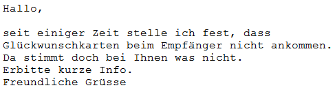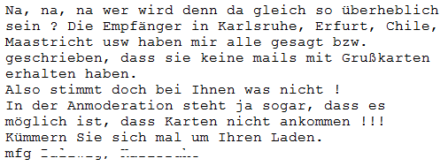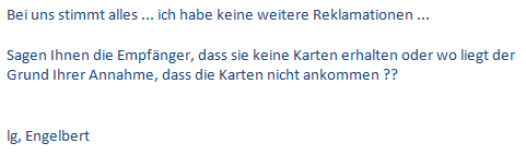 Es gibt ja viele Gründe, warum mal Karten nicht ankommen ... aber der Normalfall ist, dass erstmal keiner den Grund weiß und man einfach mal fragt ... der Satz "da stimmt doch bei ihnen was nicht" gehört nicht zu den Fragen, sondern zu den Behauptungen. Und sowas ist einfach frech. Ich hab dennoch geantwortet: