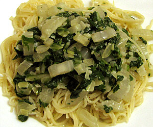 1 Strunk Mangold kleinschneiden und 2 Minuten in kochendem Wasser blanchieren ... wieder rausfischen und zu den Zwiebeln dazu geben ... ebenso Creme fraiche oder Cremefine und ein paar weitere Minuten dünsten ... mit Pfeffer und Salz und was man so mag würzen.
