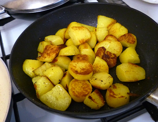 Fett in der Pfanne heiß werden lassen, Kartoffeln rein, Pfanne schwenken, Hitze kleiner drehen und Kartoffeln in Ruhe ein paar Minuten anbräunen lassen. Nicht und niemals rühren (es ist nur erlaubt, einzelne Kartoffeln mit der Gabel zu wenden, was ich aber nur ganz selten mache), nur die Pfanne schwenken (mit vor/zurück-Bewegungen aus dem Handgelenk dafür sorgen, dass die Kartoffeln ihre Position ändern). Wenn es überall Andeutungen von Braun gibt, die Hitze etwas größer drehen und ein paar weitere Minuten mit Schwenken dazwischen braten. Erst vor dem letzten Schwenken salzen und pfeffern, das wars auch schon.