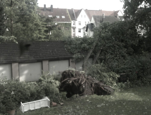 Ein Glas auf dem Boden ... die Dame, die eben noch geschrieen hat, kommt hinzu und erzählt mir auf mein "was ist denn los" etwas von "der dicken Berta", die verdammt schnell ist und beinahe in die Wohnung gerannt wäre, um Beate eine schlaflose Nacht zu bereiten.