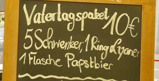 Um evtl. Kommentaren gleich vorzugreifen: nein, das ist nicht geschmacklos ... die Schwenker sind Schwenkbraten und gut gewürzt, auch Lyoner hat einen Eigengeschmack und das Bier schmeckt nach Papst.
