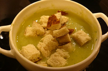 Der Schwachsinn, den ich weggelassen habe: lt. Rezept hätte ich die Kartoffeln würfeln müssen und 30 Minuten (!!) in der Suppe garen ... was müssen das für Riesenwürfel sein ... und wenn, warum so große Würfel, wenn die Suppe dann doch püriert wird ? Ich hab die Kartoffel in ganz dünne Scheiben geschnitten, dann haben 10 Minuten Garzeit gereicht. Ebenfalls 10 Minuten braucht der Romanesco. Hat richtig gut geschmeckt und das Brot obendrauf hat richtig gut dazu gepasst.