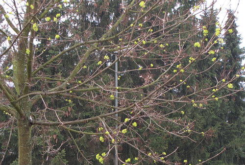 Dabei muss der Baum schon jahrelang da stehen. Und heute, am regnerischen 12. April 2010, fragen mich seine Blüten ...